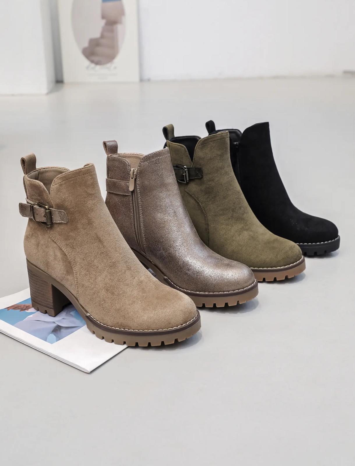 Bottine très tendance, matière simili nubuck pour un look plus mode. On adore le talon de 5cm environ pour un look plus élégant. Détail de la boucle sur le coté exterieur, semelle légérement sport avec une surpiqûre blanche.